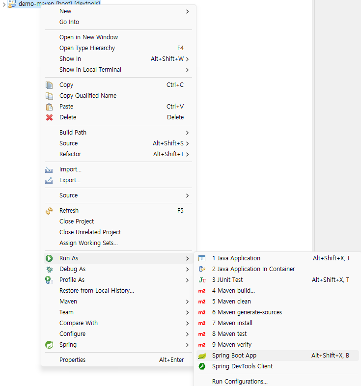 프로젝트 우클릭 > Run As > Spring Boot App을 클릭하거나 Alt + Shift + X, B로 실행할 수 있습니다.