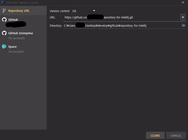2. Get from Version Control에서 Repository URL에 복사한 주소를 붙여넣고 아래에 CLONE 버튼을 누릅니다.