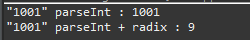 System.out.println("\\"1001\\" parseInt + radix : " + Integer.parseInt(s1, 2));