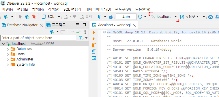만약에 파일명 부분이 <localhost> world.sql이 아니라 <None> world.sql이라고 나온다면 표시된 위치에서 DB 서버를 연결해주면 됩니다.