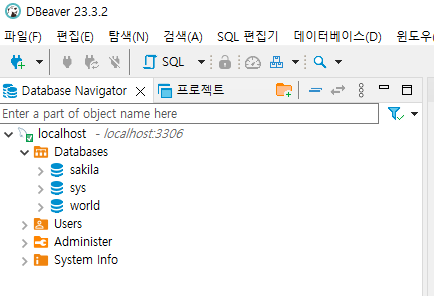 데이터베이스에 접속해보면 샘플 데이터인 sakila와 world가 추가되어있는 것을 확인할 수 있습니다.